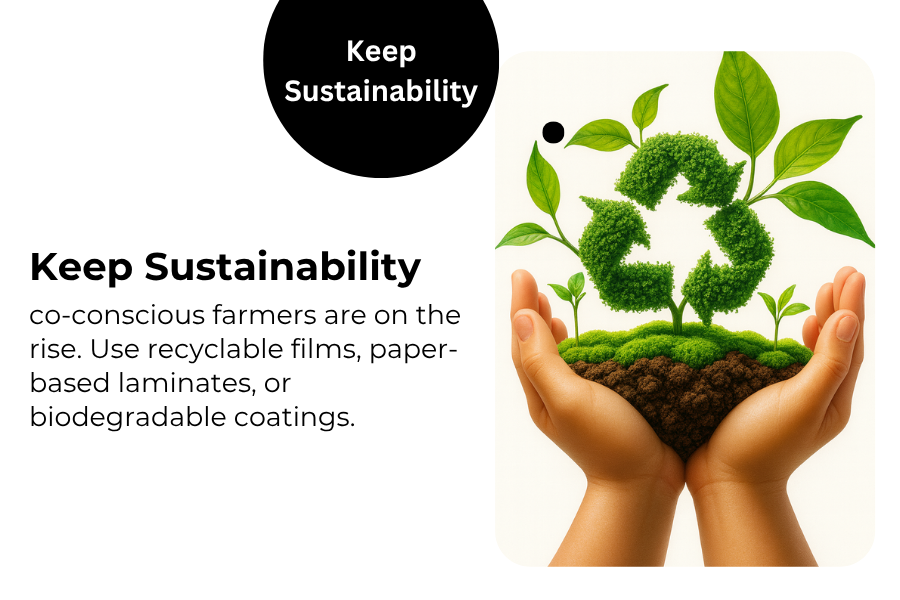 Eco-conscious farmers are on the rise. Use recyclable films, paper-based laminates, or biodegradable coatings. When your design supports both the planet and the farmer, you definitely win both markets.