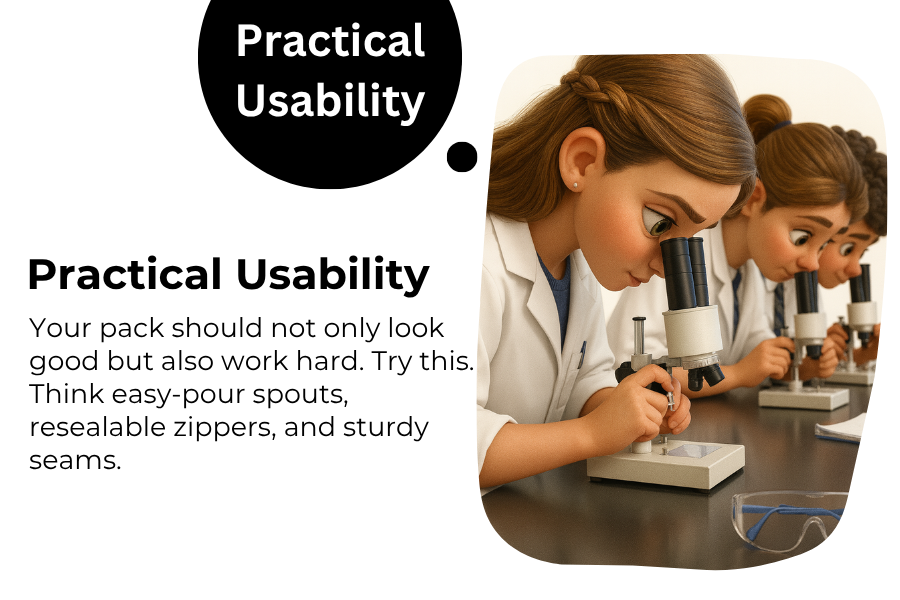 Your pack should not only look good but also work hard. Try this. Think easy-pour spouts, resealable zippers, and sturdy seams. Functionality actually builds trust way more than gloss.