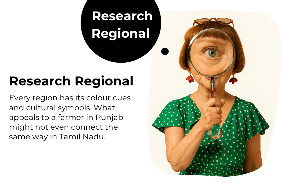Every region has its colour cues and cultural symbols. What appeals to a farmer in Punjab might not even connect the same way in Tamil Nadu. Study local languages, crops, and imagery preferences before you even sketch a line!